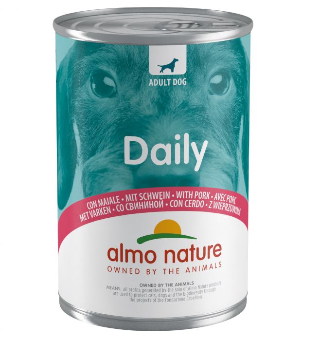 Daily recipes are prepared with ingredients suitable for pet food: complete foods which cater for a large number of adult dogs, thanks to the variety of their ingredients (muscle meat and organ meat). Daily recipes guarantee a healthy, Almo Nature quality diet, at affordable prices! The entire range is free of chemical preservatives and colours. Both the tin packaging and paper label are recyclable and, if disposed of properly, can be reused for more packaging. Daily – wet food pâté recipes – is available in 400 g cans. Almo Nature is the activist pet food brand owned entirely by Fondazione Capellino.
