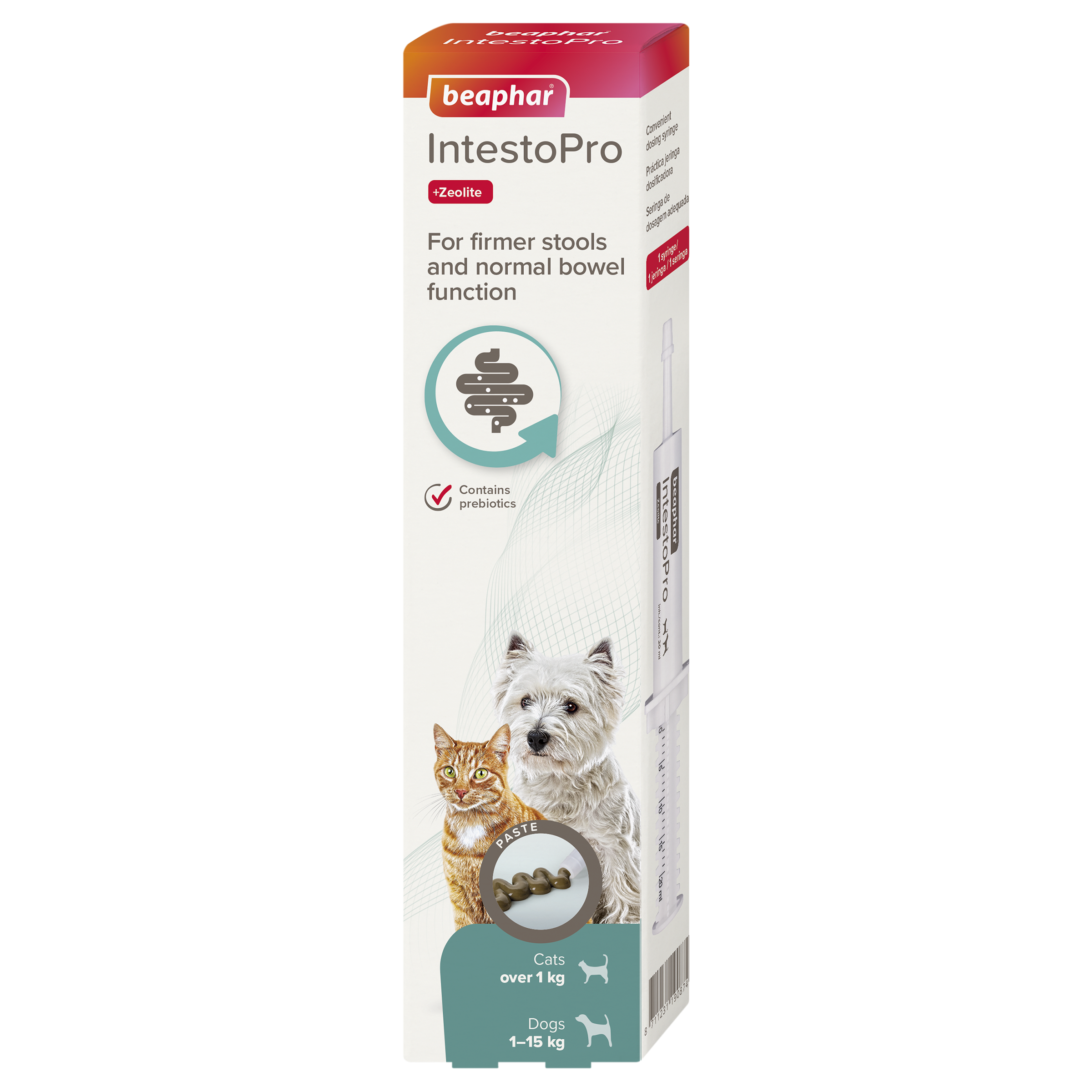 Beaphar IntestoPro is a meat-flavoured prebiotic paste designed to help relieve mild digestive upsets such as loose stools or diarrhea. It promotes healthy bowel function and helps firm up stools. Suitable for cats and small dogs weighing between 1 kg and 15 kg.