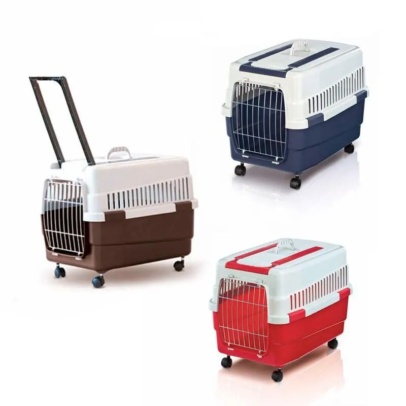 Choosing the Kim 60 dog and cat carrier combines the safety of your pet with the convenience of carrying it. Made of solid plastic this carrier is very functional. In fact it is equipped with a retractable fixed handle and a removable and extendable handle and thanks to the four pivoting wheels on the bottom, you can use your pet carrier like a trolley. The side grilles and the metal door allow proper ventilation. The safe side clips ensure easy hooking and unhooking for perfect cleaning of the carrier. Choose the medium-sized plastic carrier for cats and dogs that suits your needs from brown, pink or blue.