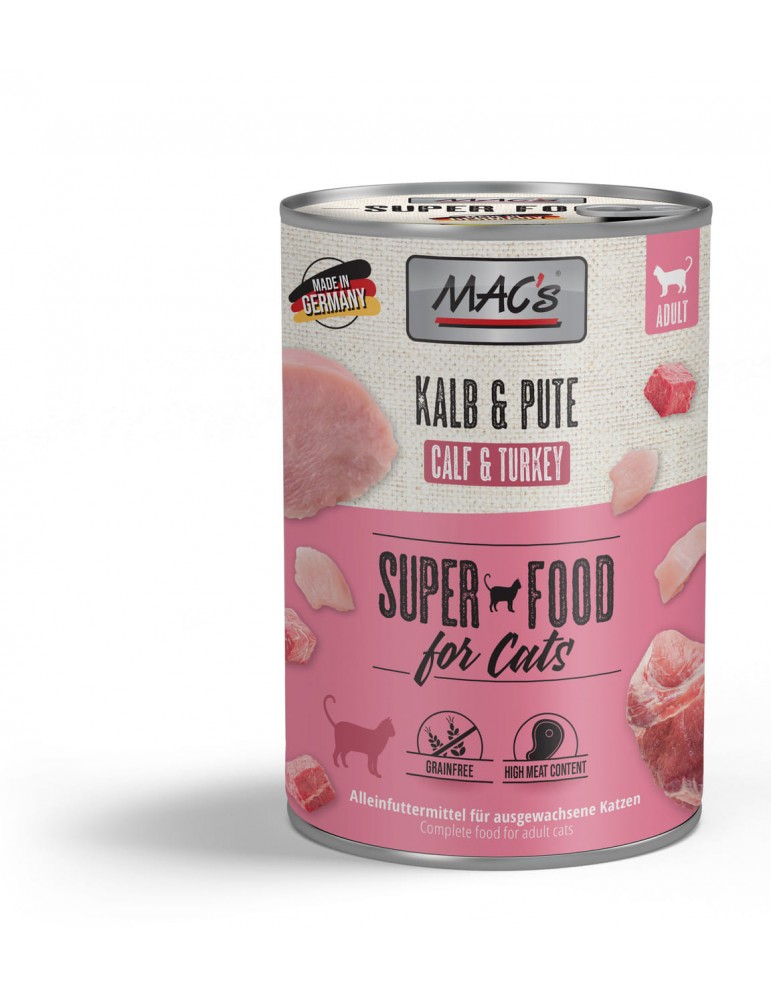 MAC’s Veal & Turkey offers your cat what it likes most – meat. The grain-free whole food was developed consistently without the addition of any carbohydrates. The combination of fresh turkey and fresh veal is very tasty. Careful preparation and the addition of vitamins and minerals ensure that your cat’s nutrition is close to nature.