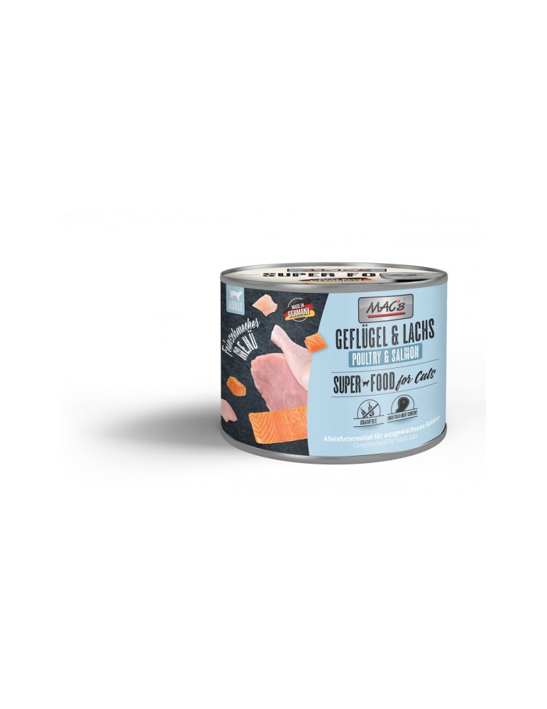 MAC’s poultry + salmon is carefully prepared using selected ingredients. The meat is exclusively produced in Germany. The combination of different ingredients ensures a balanced meal for your cat.