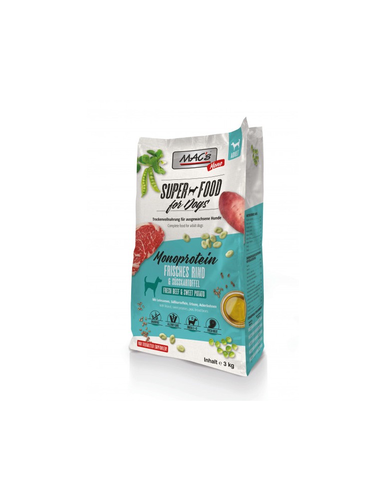 MAC ‘s MONO beef was specially developed for dogs prone to allergies. The basis is a type of meat as a source of protein and sweet potatoes and peas as a source of carbohydrates. The combination with peas, rapeseed oil, desugared beet pulp, linseed, apple and yucca schidigera ensures a balanced diet and at the same time a special mac experience for your dog.