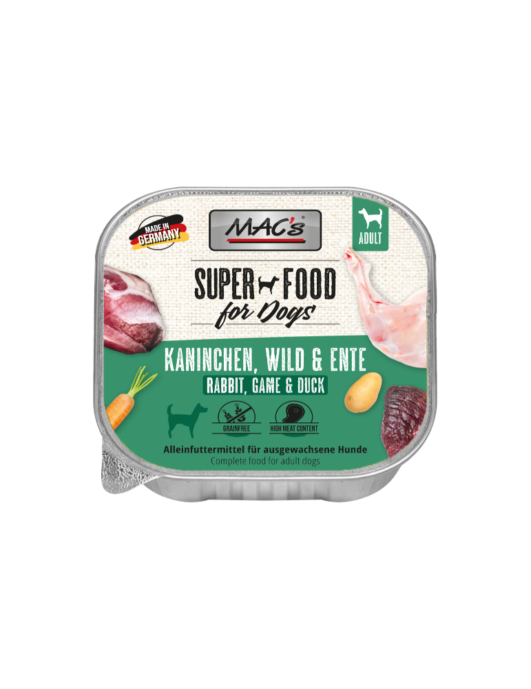 With MAC’s your dog gets what he likes best – meat. By consistently dispensing with artificial ingredients and the orientation towards a natural diet, MAC’s ensures a healthy and balanced diet for your dog. The practical aluminum bowl is a complete feed for dogs with a meat content of at least 70%.