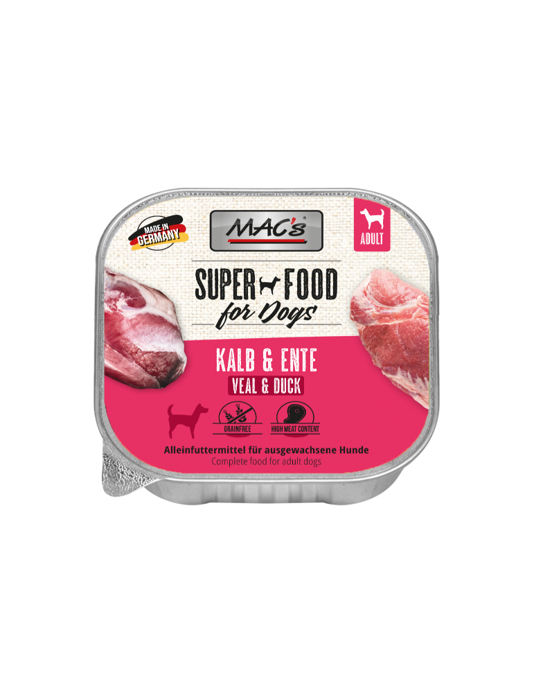 With MAC’s your dog gets what he likes best – meat. By consistently dispensing with artificial ingredients and the orientation towards a natural diet, MAC’s ensures a healthy and balanced diet for your dog. The practical aluminum bowl is a complete feed for dogs with a meat content of at least 70%.