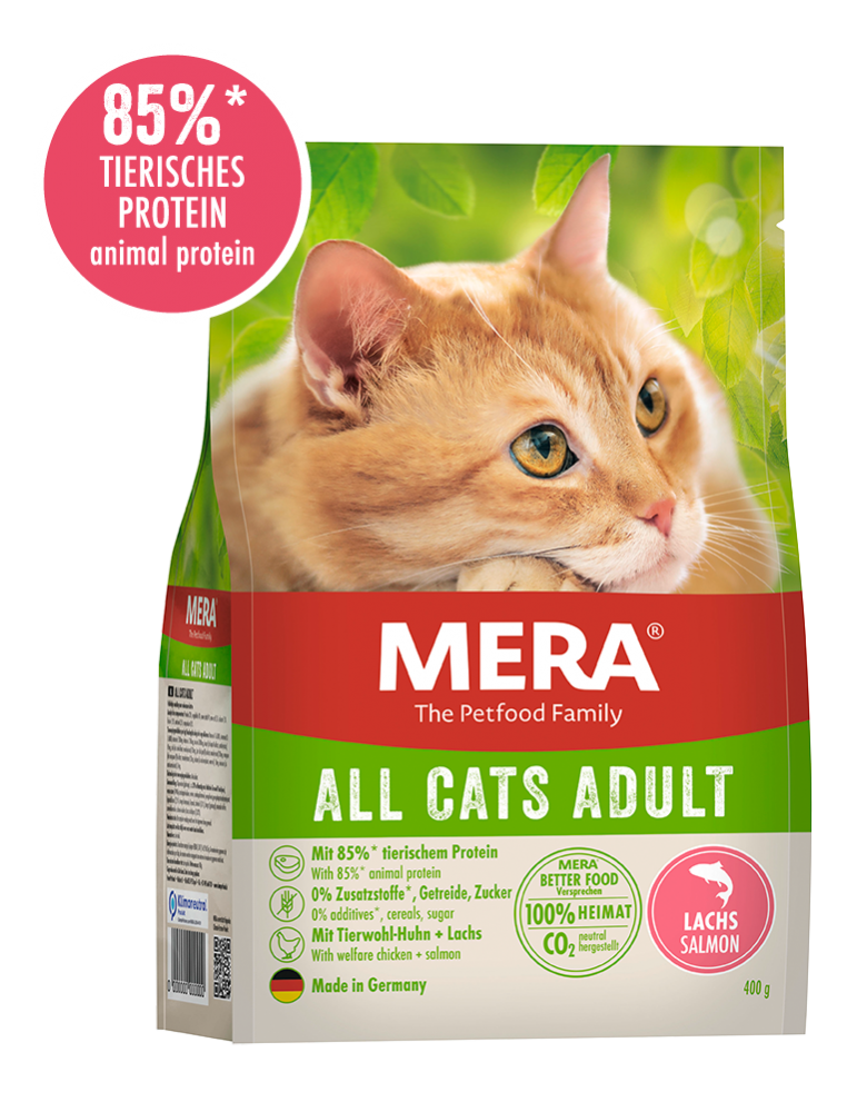 Mera All Cats Adult with Salmon is the species-appropriate and tasty dry food for all adult cats.