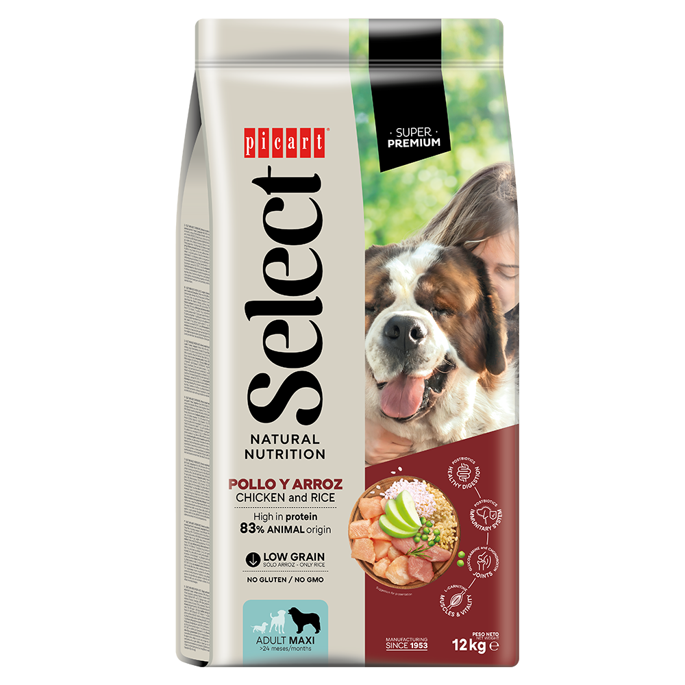 Picart Select ADULT MAXI with chicken and rice is formulated with postbiotics that offer benefits for both digestive health and the immune system, thus contributing to the overall well-being.
