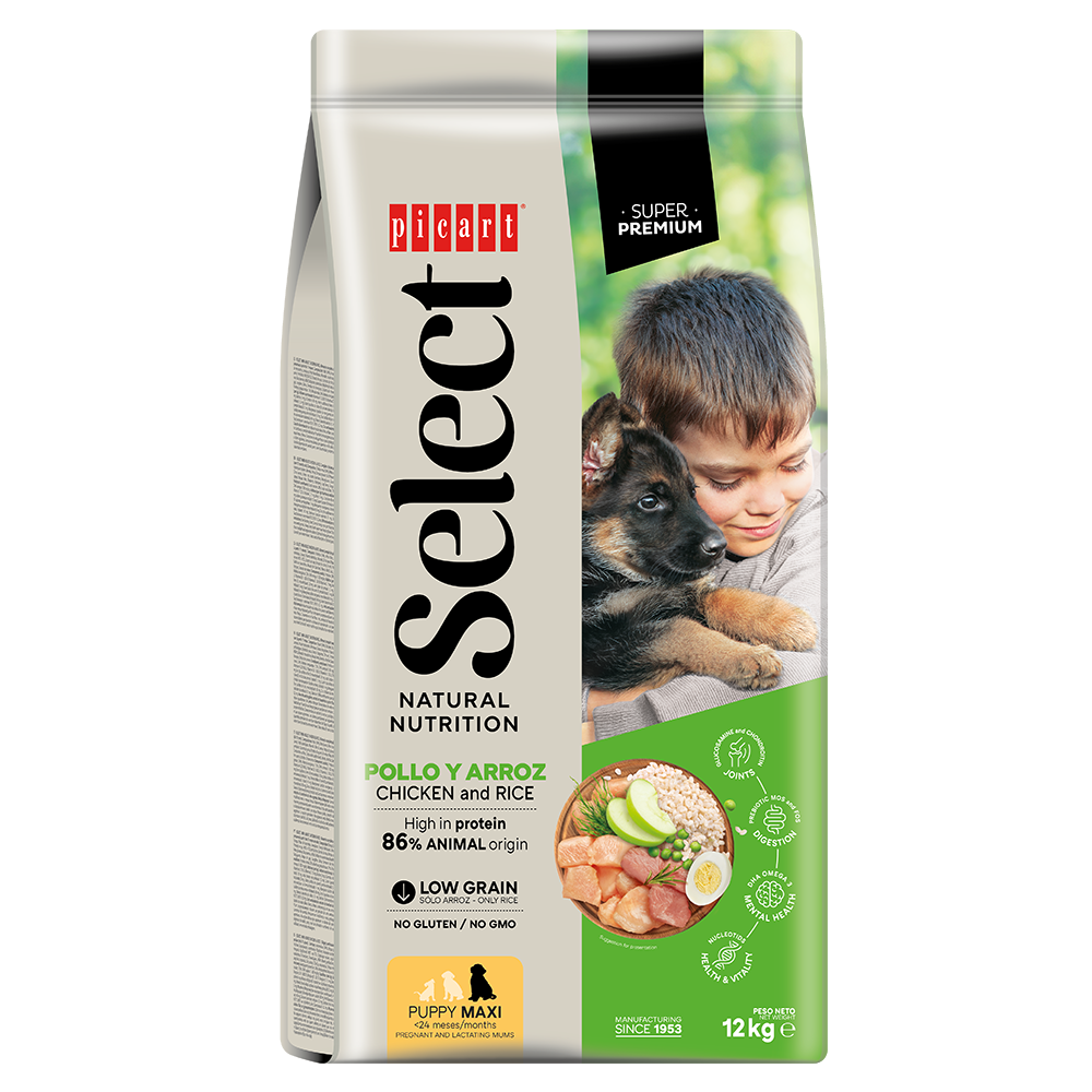 Picart Select PUPPY MAXI with chicken and rice is formulated with prebiotics that strengthen immunity and improve the digestive health of puppies, contributing to their overall well-being.