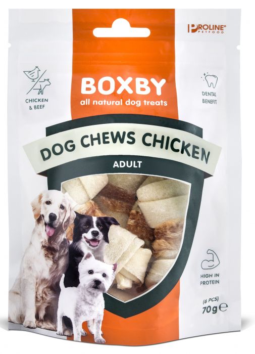 You're viewing: Proline Boxby Chews Chicken 100g Original price was: €4.60.Current price is: €3.83. Incl. VAT