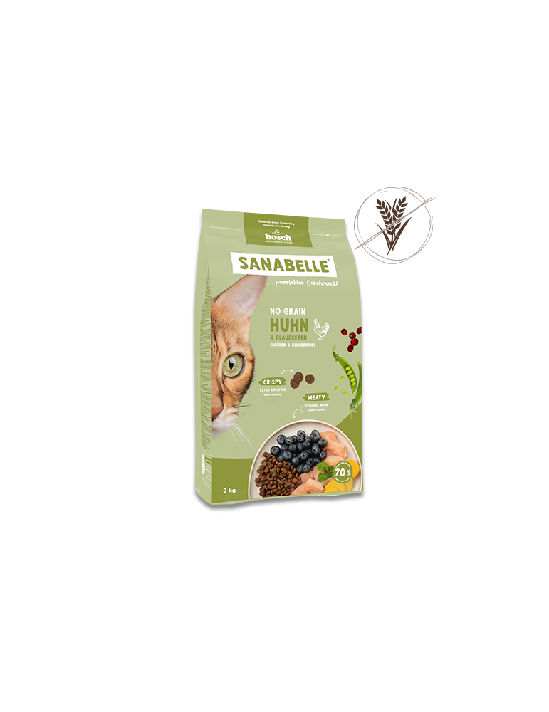 Sanabelle No Grain with Chicken & Blueberries is the ideal choice for all adult, nutritionally sensitive cats from the age of 12 months – especially for animals with a known or suspected grain intolerance. The recipe is completely grain-free and instead uses highly digestible potato as an alternative carbohydrate source.